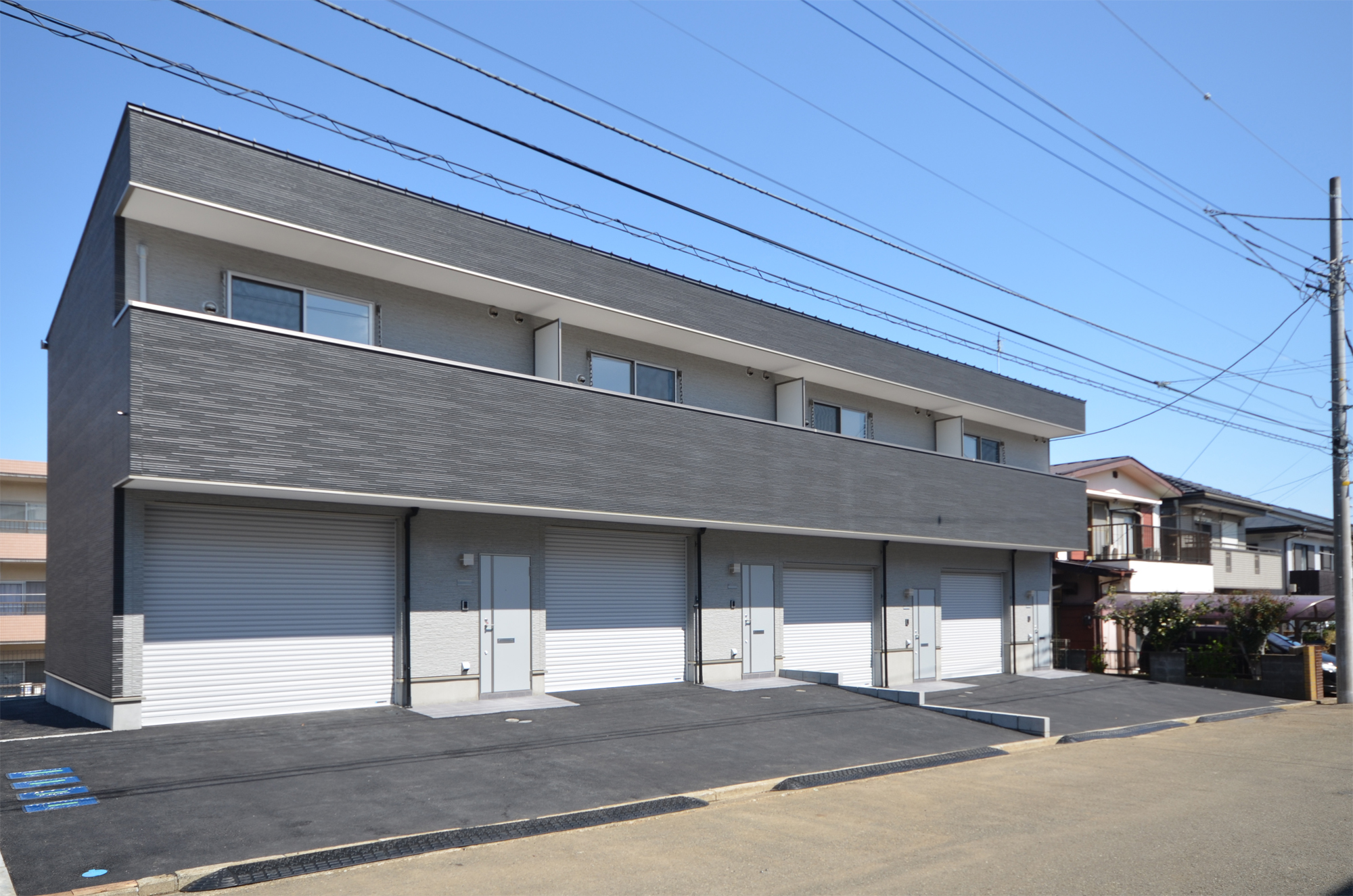 | 物件概要 | 木造2階建て 【平成28年03月竣工】 総戸数:1棟 4戸 ガレージ車1台用×4戸 ※全戸屋外駐車スペース1台付 |